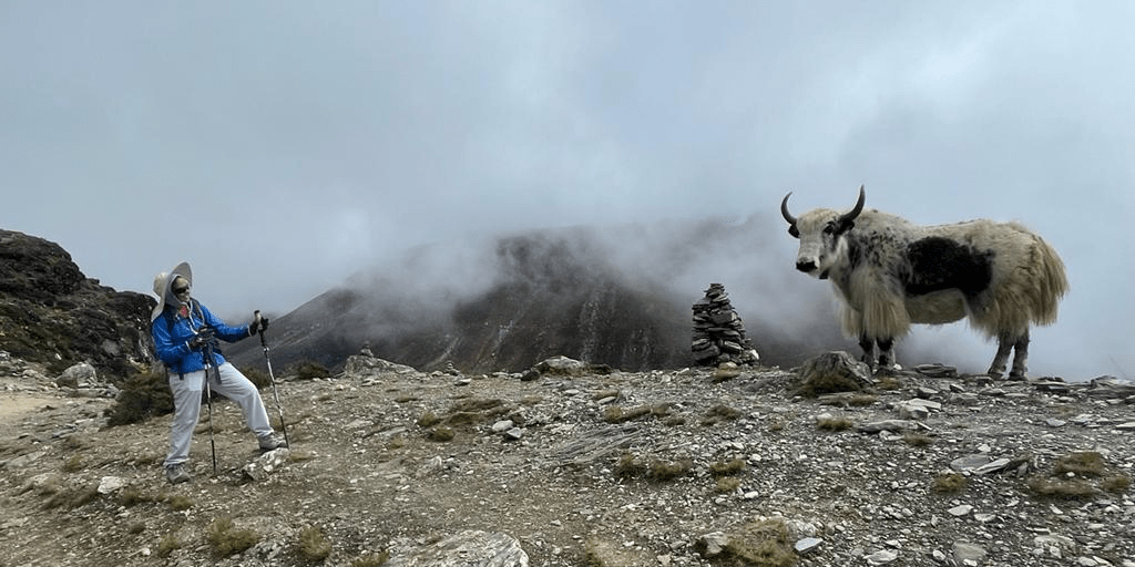 The trek started of relatively flat and then gradually ascended through a valley. We had another close encounter with Yaks! Seeing a train of them was an experience I will never forget. We are all so used to seeing cars, sky scrapers and people and not everyday can you say that you came across not one- but a lot of Yaks, while also taking in the views behind them.