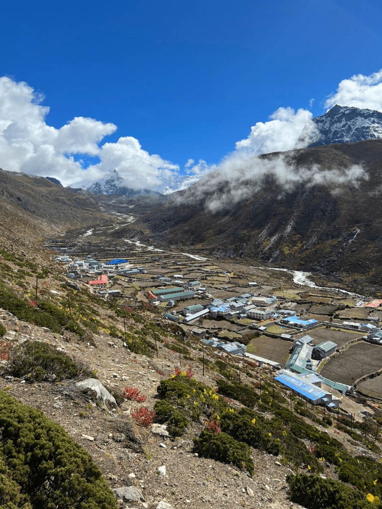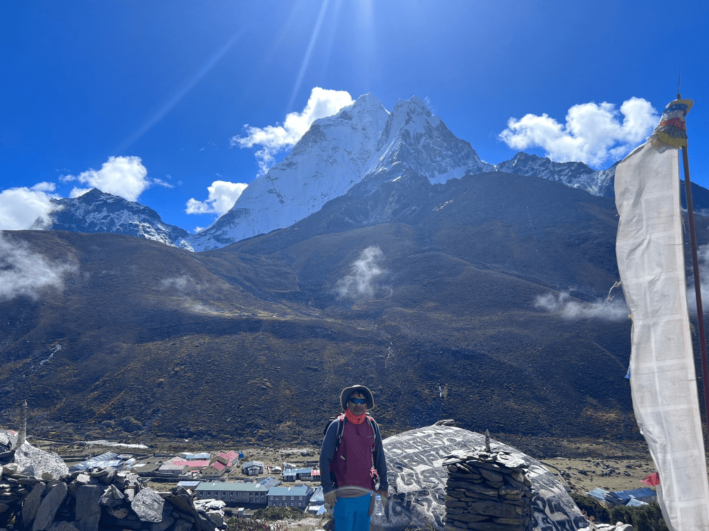 We stopped by for lunch at Dhugla and close by, ascending towards the next part of the trek, was the Sherpa monuments. These monuments are made of small stone and cement structures covered in beautiful and Vibrant prayer flags, written on each of them were prayers dedicated for the sherpas and climbers who lost their lives in the Himalayan peaks. This was a very powerful and moving part of the journey not only for me but for everyone as it really opened our eyes and made us realize that we were actually there, and that while we were, we should not take anything lightly – even if we were only trekking to the Base Camp, we were reminded that it was a challenging and serious trek.